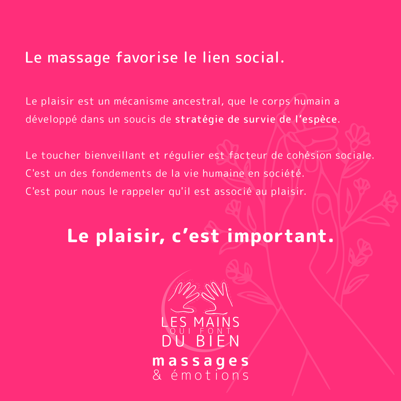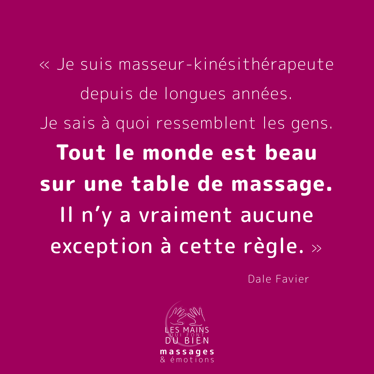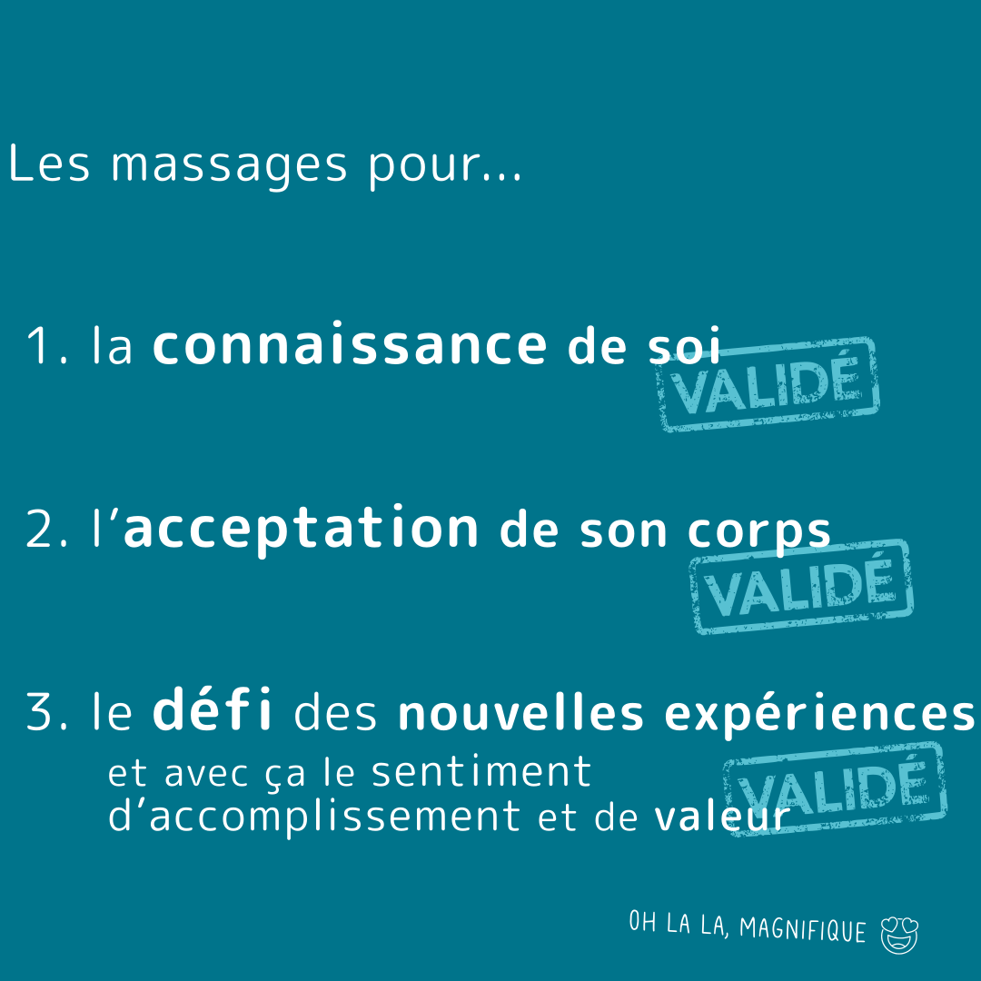 Le massage offre un cadre sécurisé pour se reconnecter à son corps. Il donne l’opportunité de voir comment on réagit lorsque quelqu’un nous voit, nous touche.